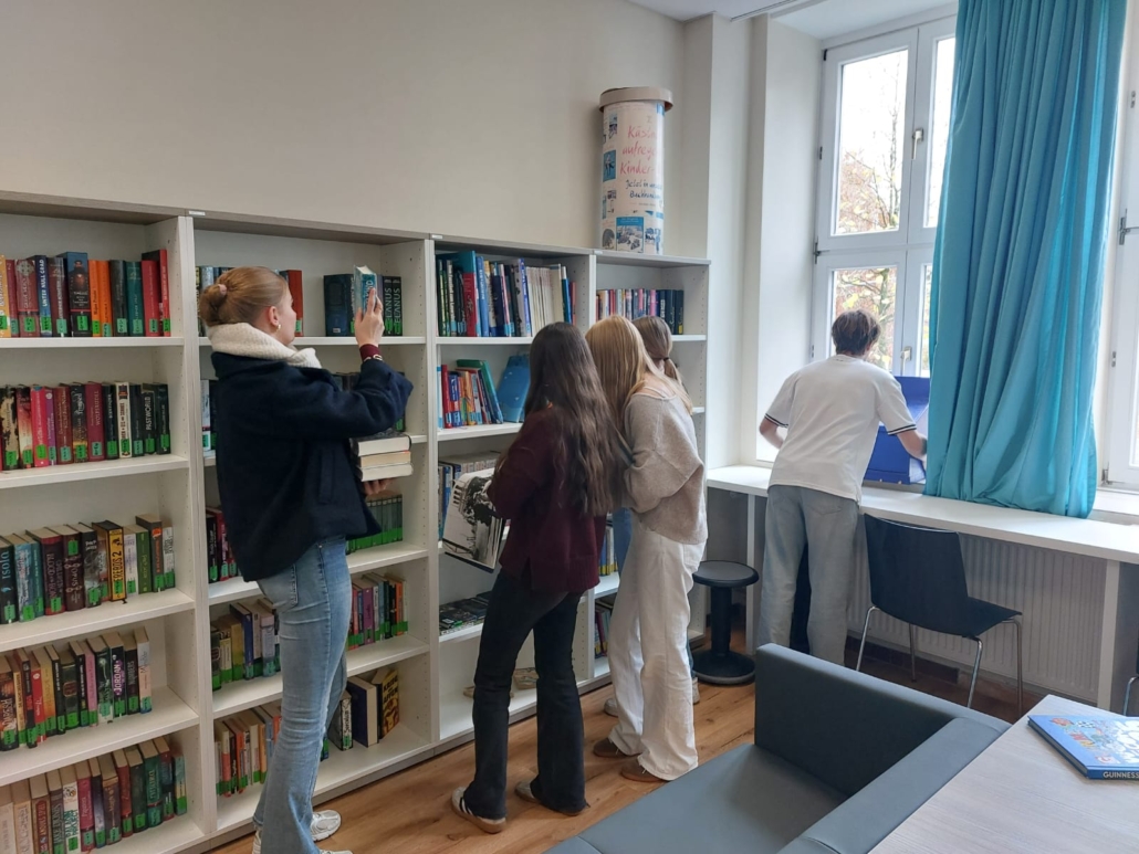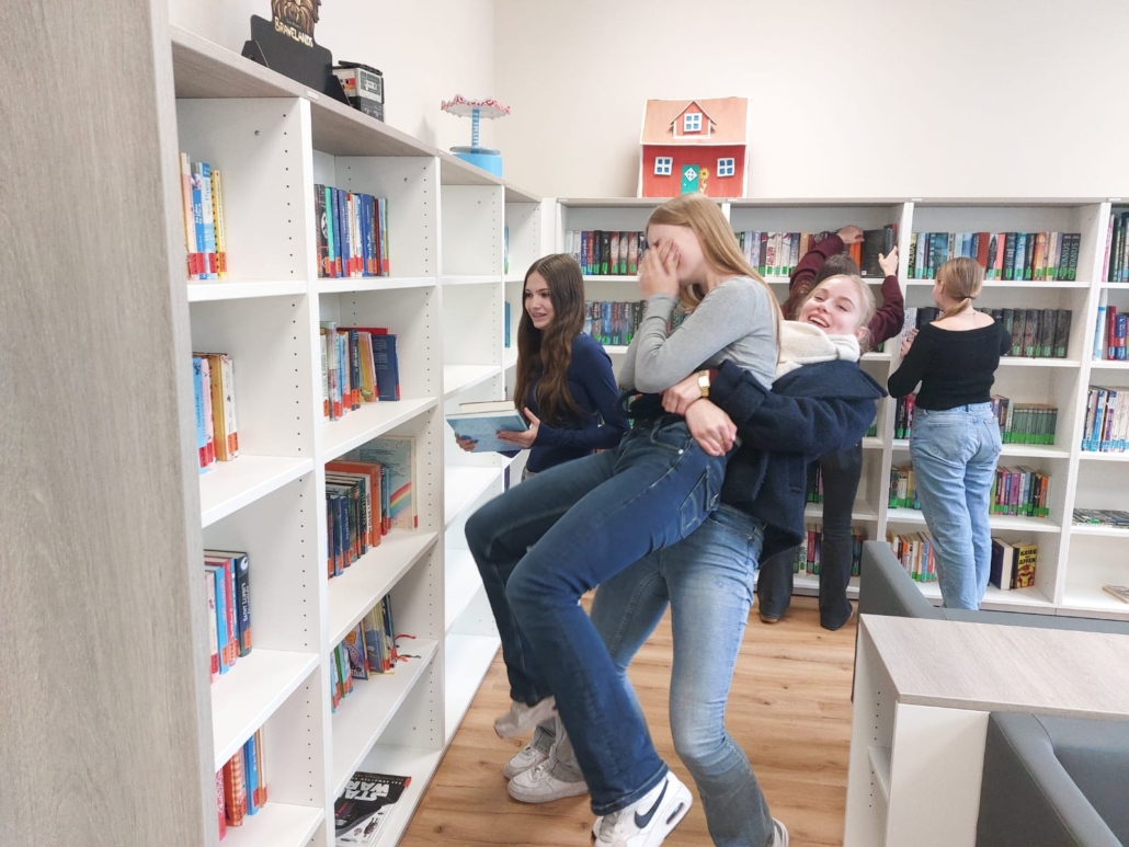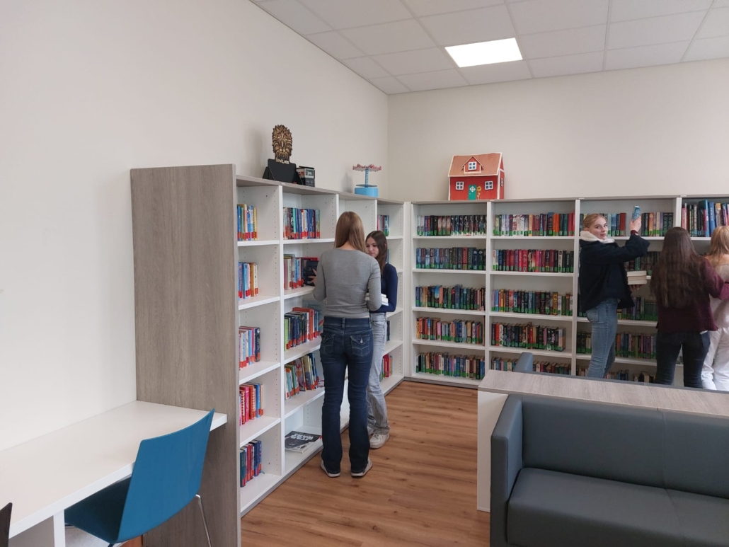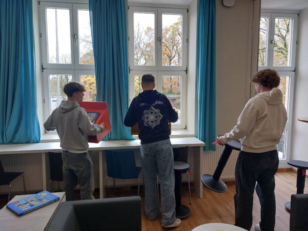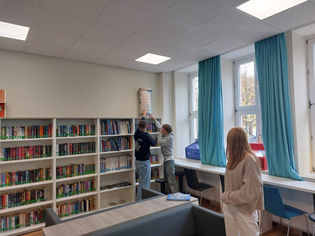 Seit Anfang November hat unsere Schule eine neue Mediothek mit vielen neuen Möbeln, z.B. neuen Tischen um zu lesen und nach Absprache auch zum Lernen. Dazu gibt es auch einige neue Sitzmöglichkeiten, welche sehr bequem sind. Ebenfalls wurden auch ein paar Möbel umgestellt, sodass es eine schöne angenehme Sofaecke gibt. Insgesamt sieht die Mediothek jetzt ordentlicher und größer aus. Auf den Fotos sieht man die 10a, die beim Einräumen geholfen hat. Schaut doch mal vorbei. (von Lana, 9d)